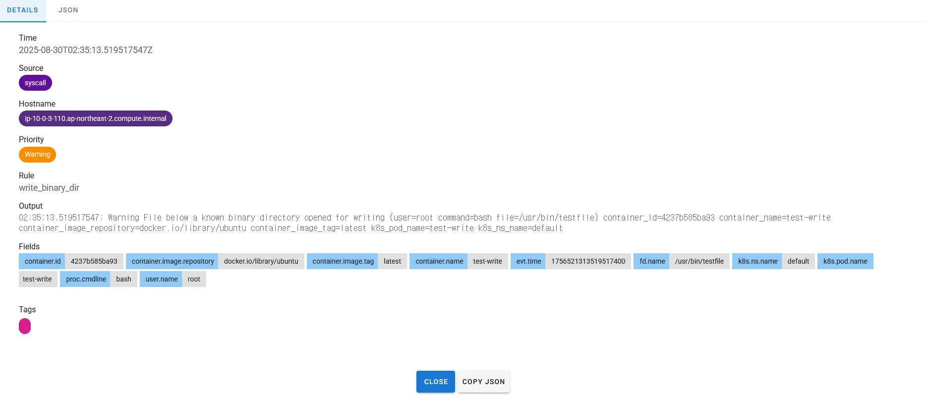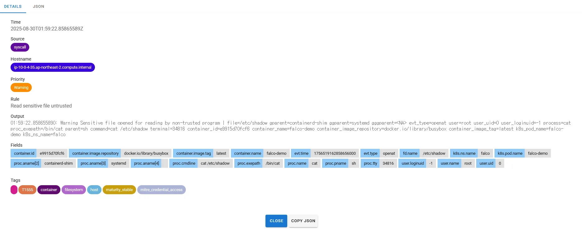 kubectl logs -n falco -l app.kubernetes.io/instance=falco -c falco -f