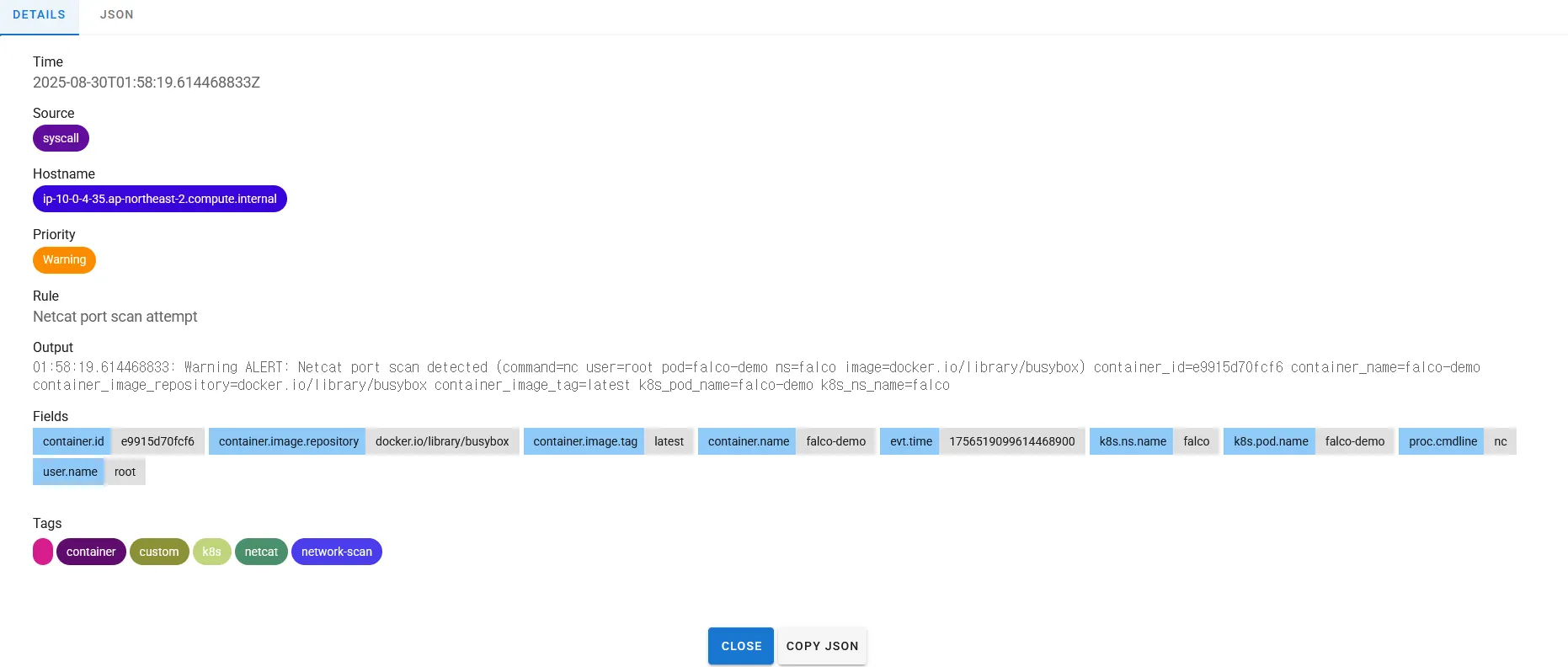 ALERT: Netcat port scan detected (command=%proc.cmdline user=%user.name pod=%k8s.pod.name ns=%k8s.ns.name image=%container.image.repository)