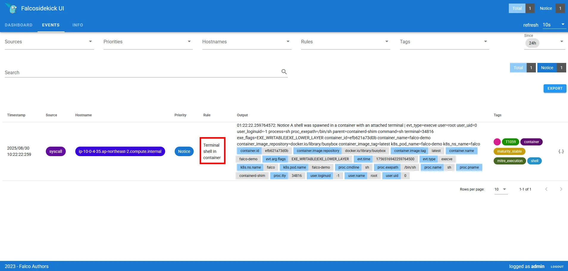 kubectl run falco-demo -n falco --rm -ti --image busybox /bin/sh