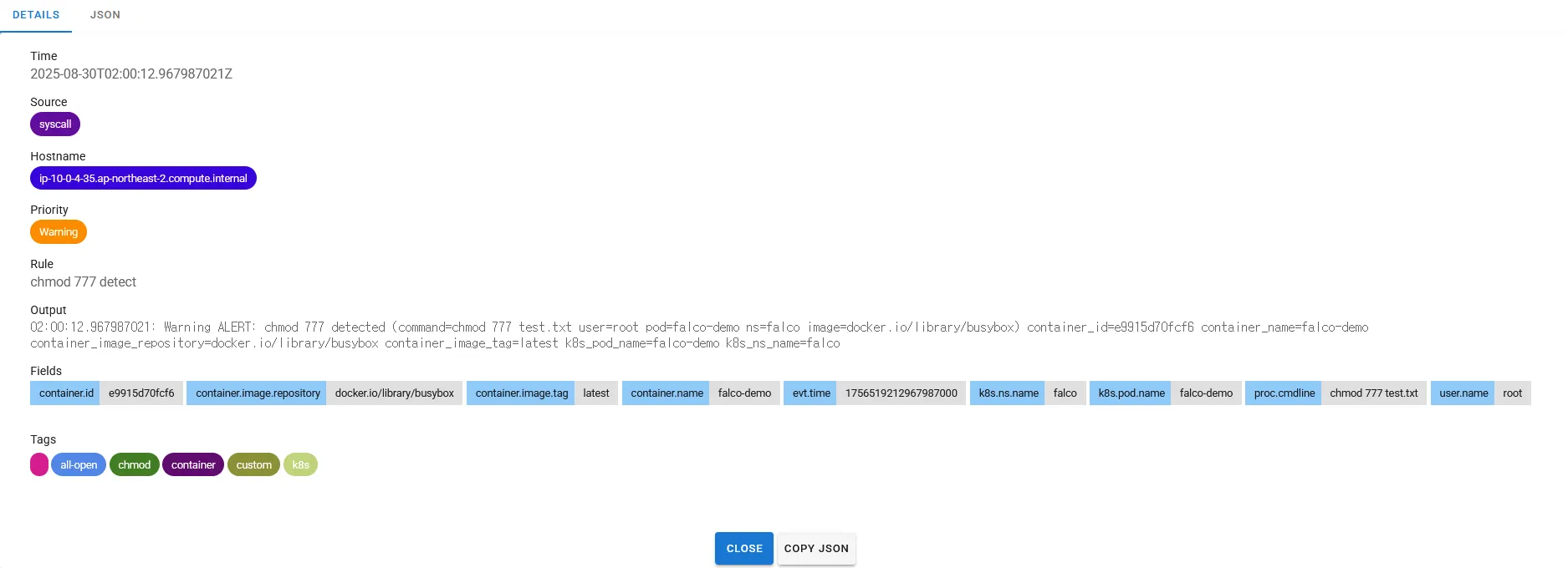 ALERT: chmod 777 detected (command=%proc.cmdline user=%user.name pod=%k8s.pod.name ns=%k8s.ns.name image=%container.image.repository)