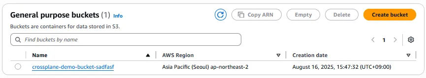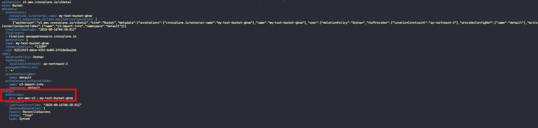 crossplane.io/external-name: my-test-bucket-gbsw # Bucket Name