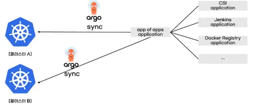 필요한 쿠버네티스 리소스를 application으로 정의하고 여러 application을 app of apps패턴으로 관리하면, 쉽고 빠르게 쿠버네티스 리소스를 새로운 쿠버네티스 배포할 수 있습니다. 또 다른 장점은 동일한 app of apps패턴을 여러 클러스터에 배포하면 동일한 쿠버네티스 인프라가 구축됩니다.