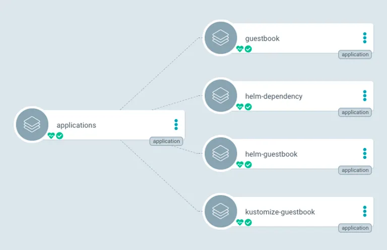 각 application마다 sync버튼을 눌러보세요. application이 sync될 때마다 쿠버네티스 리소스가 배포됩니다. 쿠버네티스 리소스가 모두 배포되면 모두 healthy상태가 됩니다.