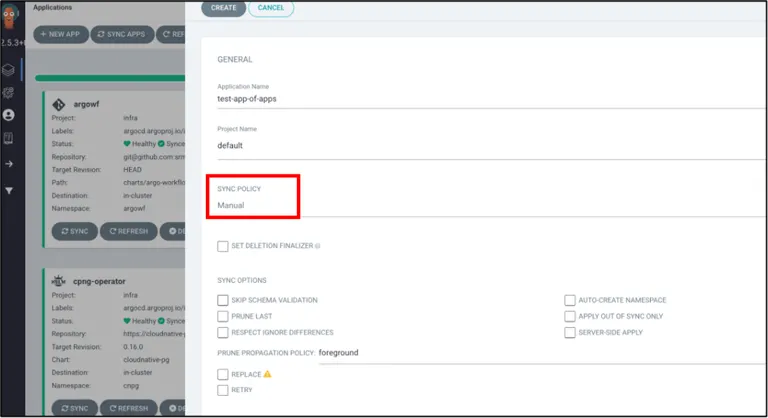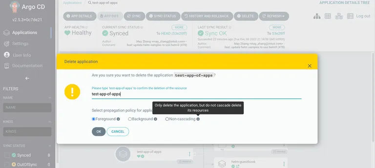 디폴트 옵션인 cascade를 선택하면 app of app application과 모든 application이 삭제됩니다. 하지만, non cascade를 선택하면 app of app application만 삭제되고 다른 application은 유지됩니다.