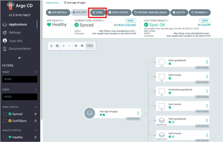 application을 생성하고 sync버튼을 클릭합니다.