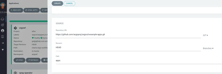 source는 argoCD 공식 예제 repo를 입력하고 path는 apps를 설정합니다.