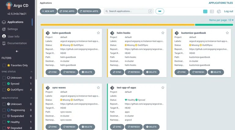 helm차트 템플릿에 정의된 application이 생성됩니다. 각 application의 sync 옵션이 manual로되어 있기 때문에 out of sync로 되어 있습니다.
