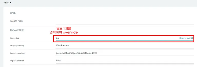 또는 필드 1개씩 입력하여 helm values를 override할 수 있습니다.