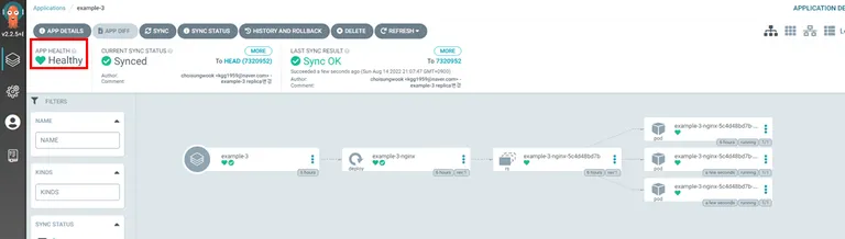 Sync Status git과 쿠버네티스 현재 상태를 비교한 결과를 보여줍니다. 디폴트로 3분마다 또는 사용자가 Refresh을 수행하면 Sync Status가 업데이트 됩니다.