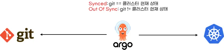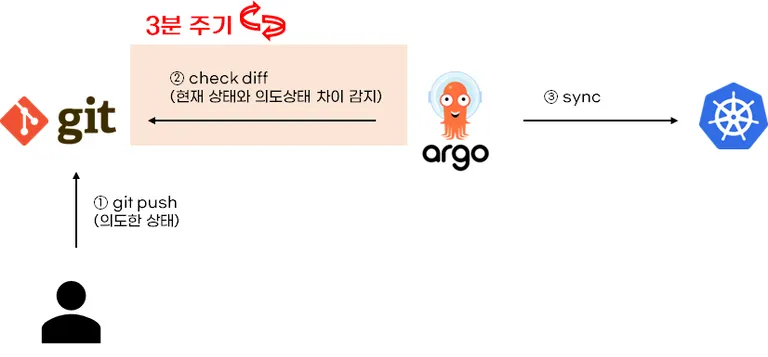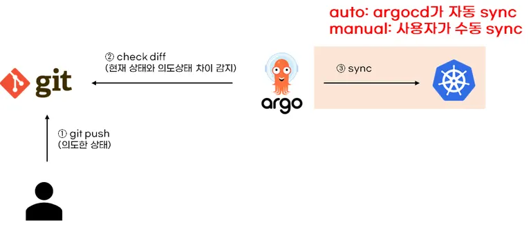 Sync는 git에 있는 의도된 상태를 쿠버네티스 클러스터에 배포하는 작업으로 동기화라고 불립니다. sync의 조건은 git과 쿠버네티스 현재 상태와 차이가 있어야 합니다.