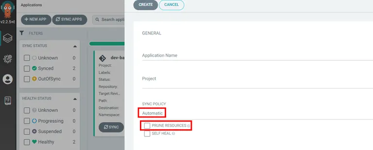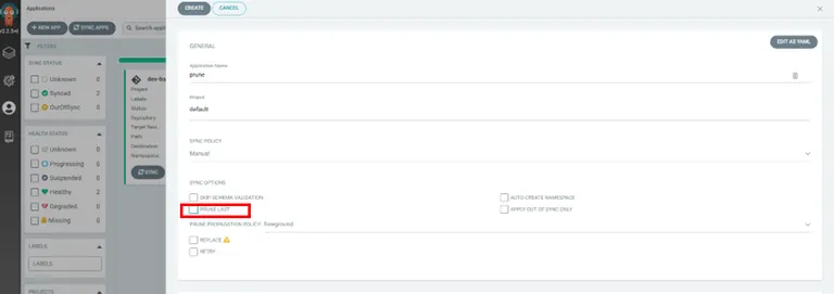 prune은 동기화된 리소스 삭제옵션입니다. argocd로 쿠버네티스 리소스를 동기화하고 git에서 리소스를 삭제할 때, 해당 리소스를 쿠버네티스에서 삭제할지 유지할지 결정하는 옵션입니다.