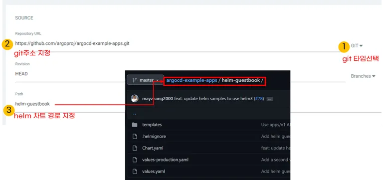 두 번째 방법은 git에 있는 helm차트 경로를 직접 지정하는 방법입니다. “GIT’타입을 선택 한 후 git 주소 helm차트 경로를 지정하면 됩니다.