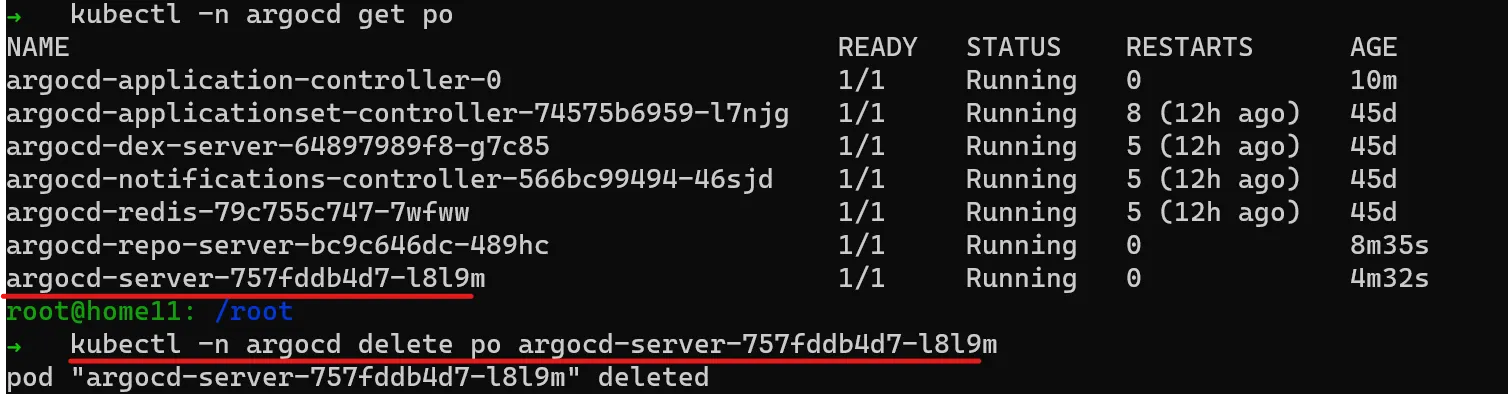 ArgoCD Application을 삭제하면 어떻게 될까요? pod는 ArgoCD로 생성하지 않았습니다. 하지만, Application 관리범위에 있으므로, Application삭제 시 같이 삭제됩니다.
