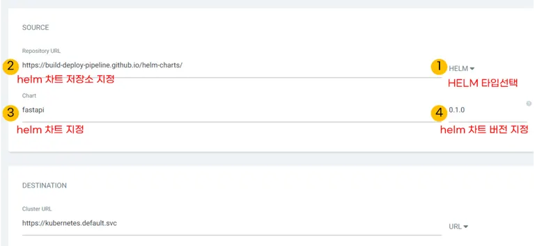 helm차트 저장소를 선택하려면 source타입을 “HELM”을 선택하면 됩니다. 그리고 helm차트 주소를 지정하면 helm차트 목록과 helm차트 버전이 자동으로 출력됩니다.