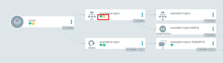 Prune이 비활성화 되어 있으면 리소스는 삭제되지 않지만 X표시 아이콘이 보입니다.