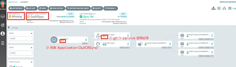 Sync Status가 OutOfSync일 때, 어떤 리소스가 git과 클러스터 상태가 불일치 한지 보여줍니다. 예를 들어 service가 불일치하여 service에만 불일치 아이콘이 보입니다.