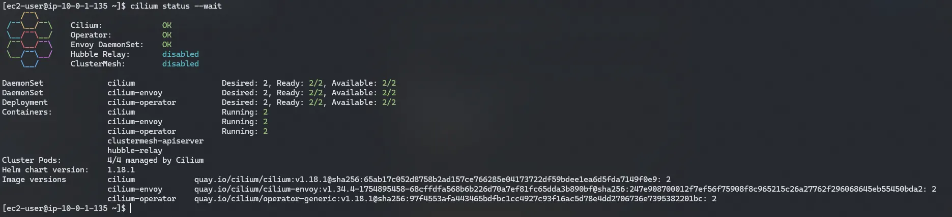설정한 taint는 제거되기 전까지 pod 실행을 block하다가, cilium이 node에서 실행되어 노드를 초기화 하고, 준비가 되면 node의 taint를 제거하게 됨, pod의 실행이 가능해지고 cilium이 네트워크를 관리하게 된다.