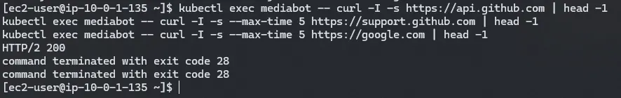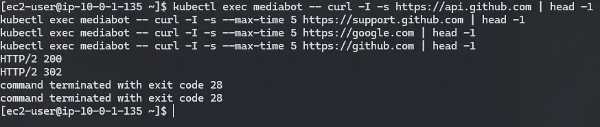 kubectl exec mediabot -- curl -I -s --max-time 5 https://support.github.com | head -1