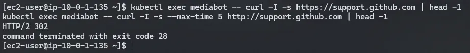 kubectl exec mediabot -- curl -I -s --max-time 5 http://support.github.com | head -1
