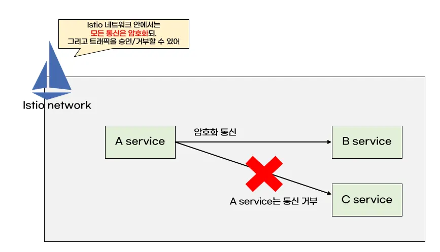 보안은 istio 네트워크에서 발생하는 트래픽을 보호하고 트래픽을 승인/거부할 수 있습니다. TLS 또는 mTLS를 적용하며 istio 네트워크에서 발생하는 모든 트래픽을 암호화합니다. 그리고 원치 않은 트래픽은 거부할 수 있도록 트래픽 권한을 설정할 수 있습니다.
