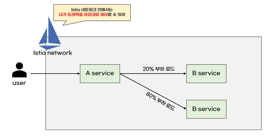 Istio는 A 서비스 -> B 서비스로 로드 밸런싱 할 때 마음대로 비율을 정할 수 있습니다. 아래 그림은 2:8비율로 로드 밸런싱을 했습니다.