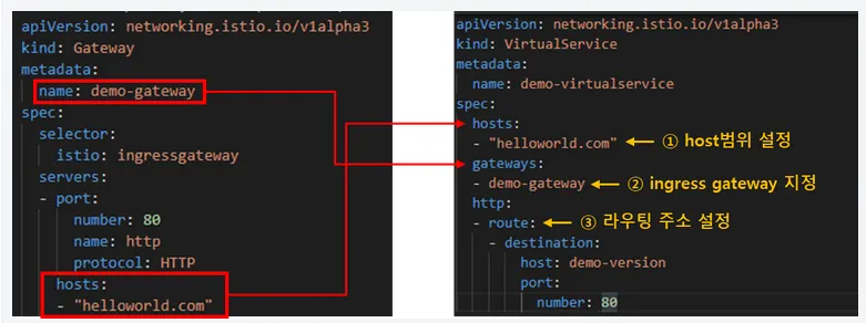 virtualservice는 ingress gateway의 라우팅 설정을 담당합니다. 즉, ingress gateway 역할을 하는 proxy설정을 정의합니다. 최소 설정은 ingress gateway이름, host범위, 라우팅 설정입니다. 이외에 로드밸런싱 비율 등을 설정할 수 있습니다.