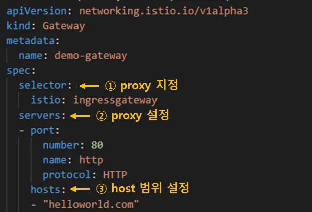selector는 gateway동작을 담당하게 될 proxy를 설정합니다. nginx, envoy등 proxy를 설정할 수 있습니다. 보통 envoy proxy를 사용합니다. ingress gateway는 1개 이상 존재해야 합니다.