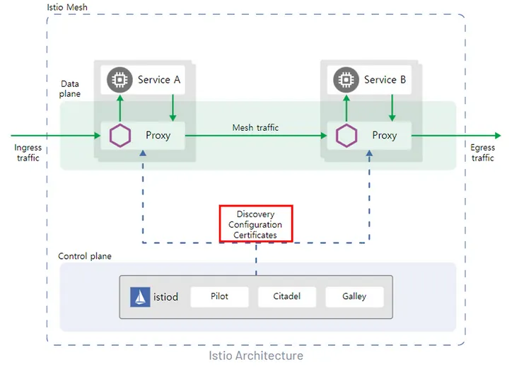 Istio에서는 사이드카로 설치된 Proxy를 동적으로 설정 변경이 필요합니다. Enovy Proxy에서는 동적으로 변경할 수 있는 XDS프로토콜을 지원합니다. Kubernetes환경에서 Istio는 Aggregated Discovery Service (ADS)를 사용하고 istiod가 동적 설정을 담당합니다.
