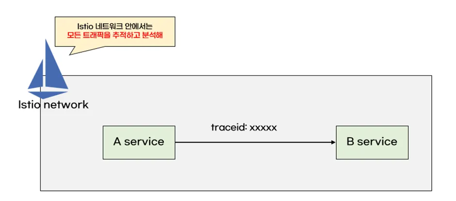 옵저빌리티는 istio 네트워크 안에서 발생하는 트래픽을 추적하고 분석하며 시각화합니다. 어느 구간에서 지연이 발생하는지, 장애가 발생하는지 등을 쉽게 발견할 수 있습니다.