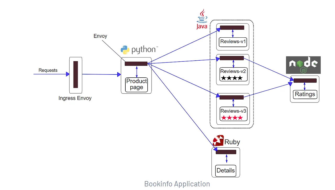 istio는 istio를 잘 이해할 수 있도록 book application 샘플을 제공합니다. 마이크로서비스로 개발되어 있어서 다양한 언어로 개발되어 있습니다.