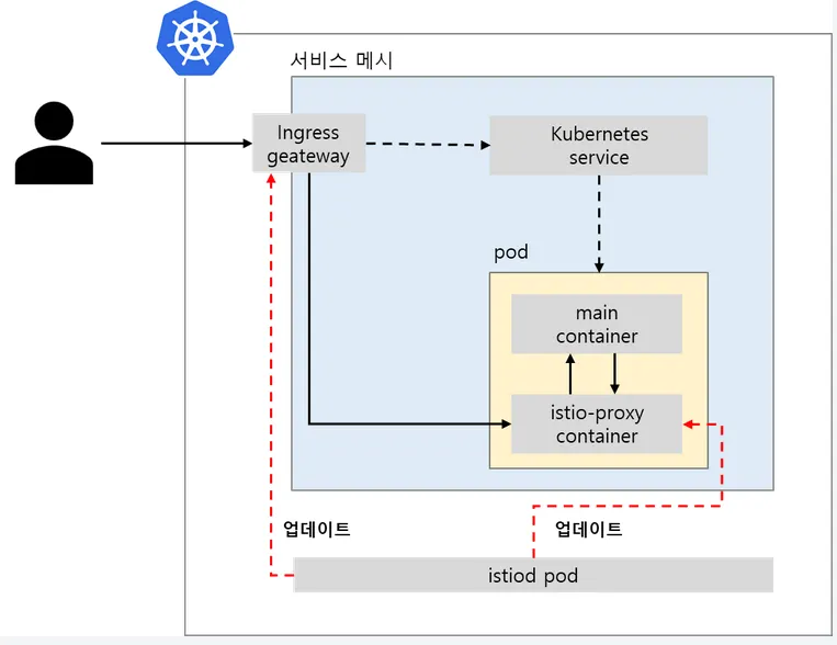 istio가 관리하는 서비스 메시영역은 ingress gateway로 접근이 가능합니다. ingress gateway를 거치지 않으면 일반 쿠버네티스 통신을 따릅니다. ingress gateway는 sidecar로 설치된 istio-proxy(envoy)로 트래픽을 전달합니다. pod에 쿠버네티스 service가 설정되어 있으면, service가 가리키는 endpoints pod정보를 조회합니다. 그리고 서비스를 거치지 않고 다이렉트로 pod로 트래픽을 전달합니다.