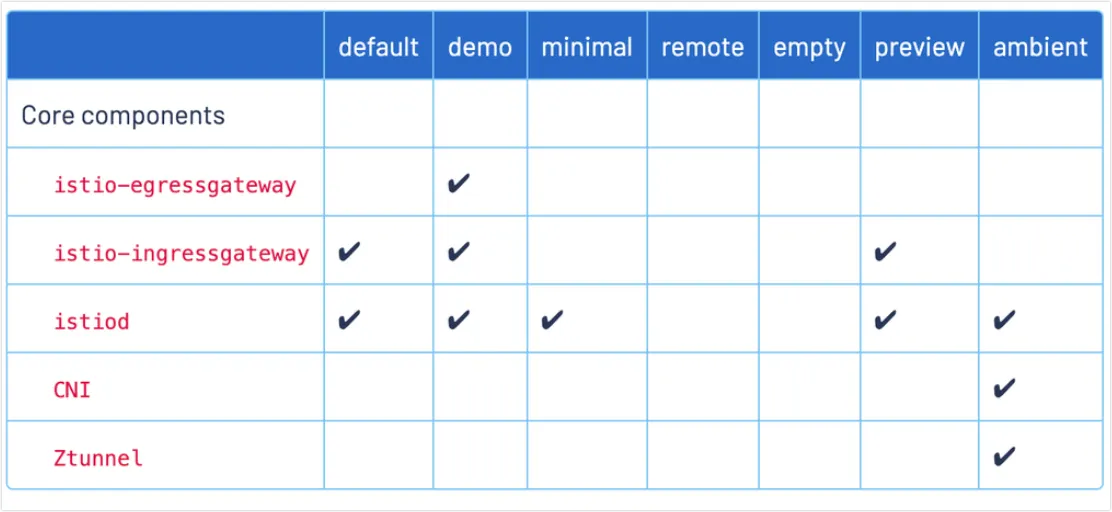 이 프로필은 IstioOperator API의 기본 설정에 따라 구성 요소를 활성화합니다. 이 프로필은 프로덕션 배포 및 다중 클러스터 메시의 기본 클러스터에 권장됩니다.