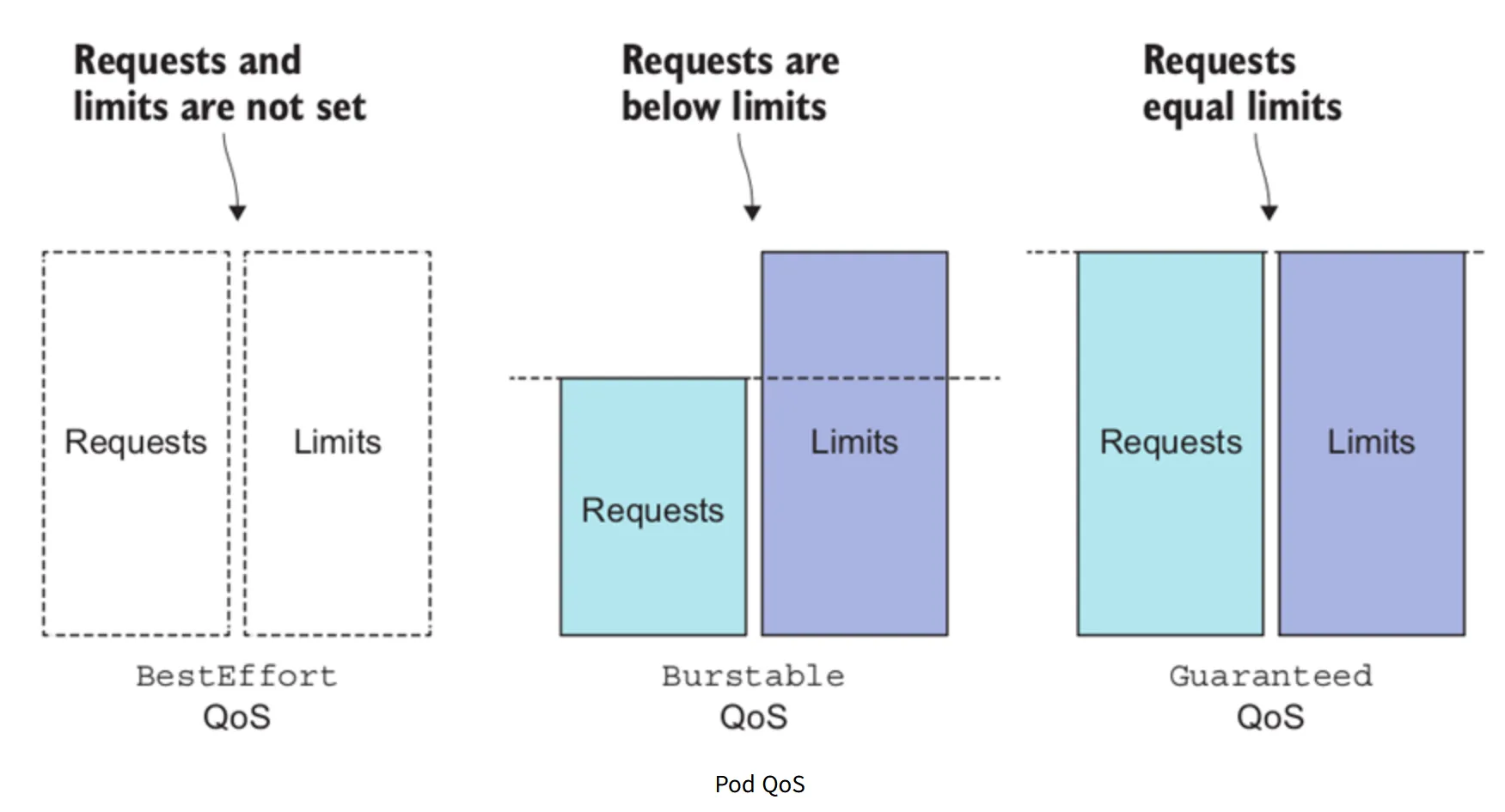 쿠버네티스에서는 리소스가 부족할 때 QoS에 따라 어떤 파드의 컨테이너 애플리케이션을 Kill할지 정합니다. 가장 우선순위가 낮고 처음에 kill되는 것은 BestEffort이며, 그 다음이 Burstable, 마지막이 Guranteed가 kill됩니다. Guranteed는 시스템이 메모리를 필요로 하는 경우에만 kill됩니다. 만일 동일한 QoS의 경우 OutOfMemory Score에 따라 어떤 프로세스를 kill할지 비교하여 정합니다.